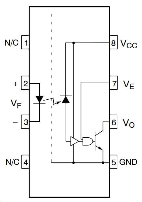 Оптопара HCPL-0611 состоит из арсенид алюминий-галлиевого светодиода, который воздействует на фотодиод. Он подключён к буферу элемента “ИЛИ” и расположен на базе биполярного транзистора.