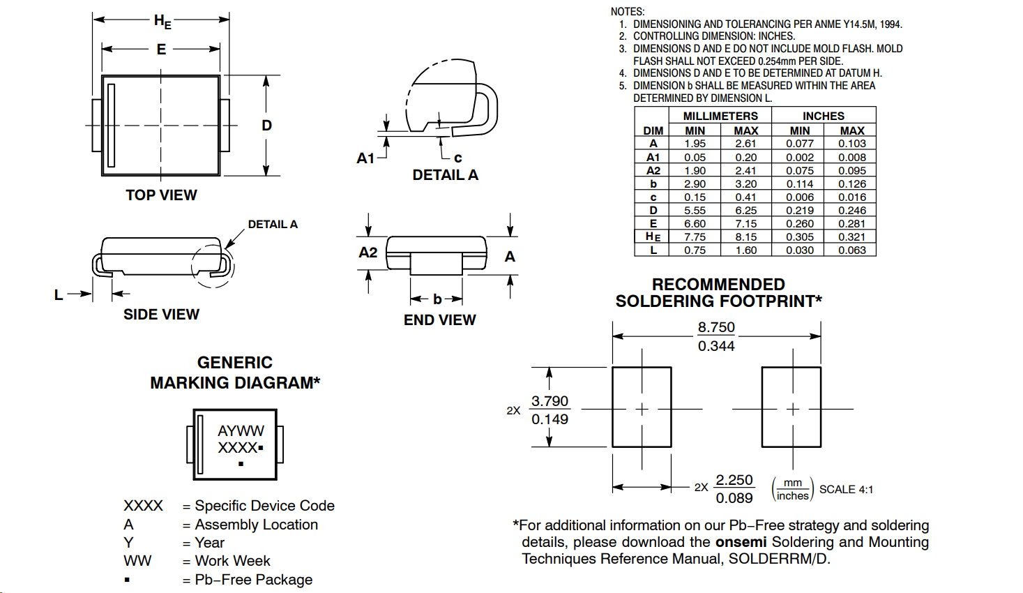 Имеет эпоксидный SMC корпус для монтажа в схемы с малым количеством места, а также знаковые обозначением модели.