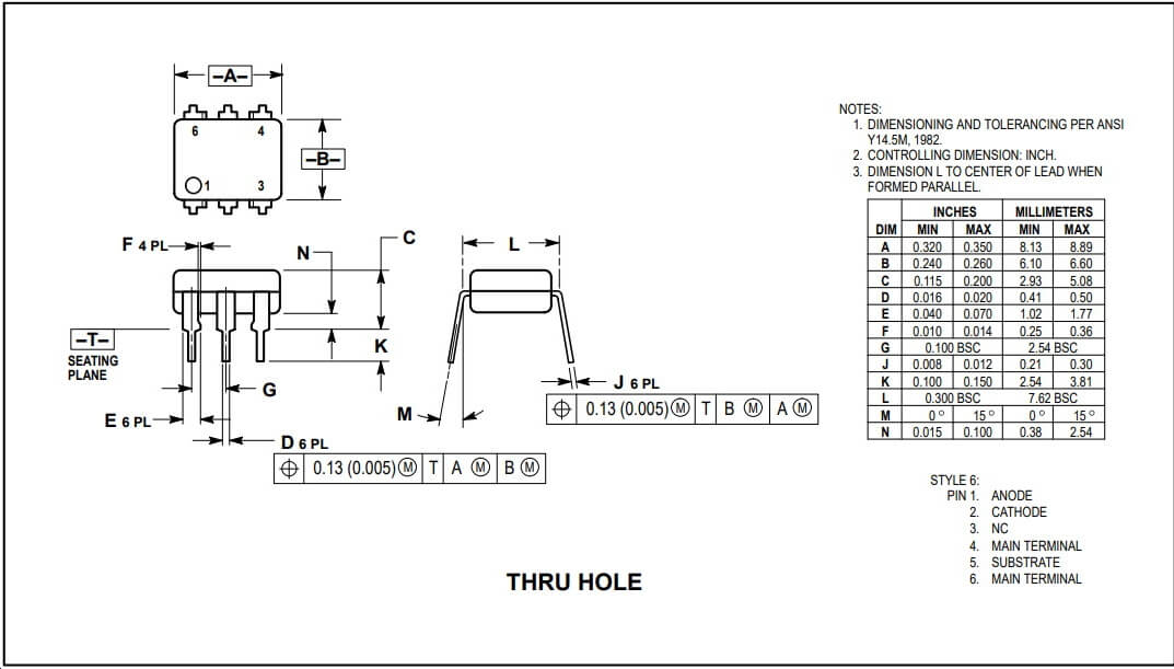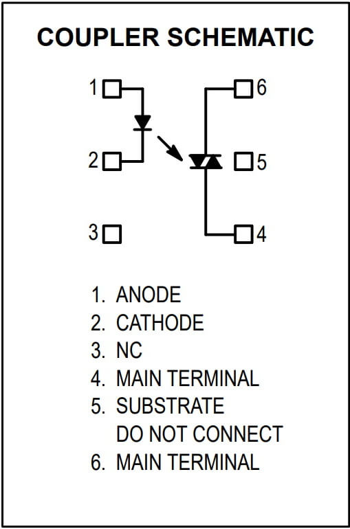 MOC3052 выполнен в корпусе DIP-6 c пометкой анода светодиода.